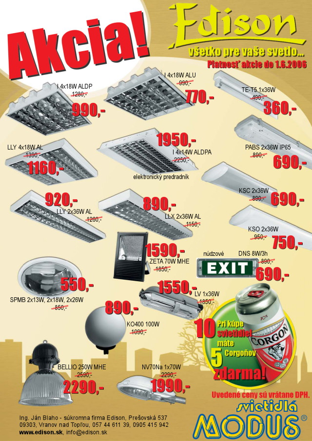 Vitajte na našich stánkach!Firma EDISON poskytuje kompletné elektromontážne služby a predaj elektromateriálu. Máme dlhoročné skúsenosti zvlášť v spolupráci s obecnými úradmi na východnom Slovensku, ktorým zabezpečujeme bezporuchovú prevádzku vonkajšieho verejného osvetlenia a rozhlasu. Najdete nás na predmestí ako aj v centre mesta Vranov nad Topľou. Aktuálna ponuka pre obecné úrady za SUPER ceny!